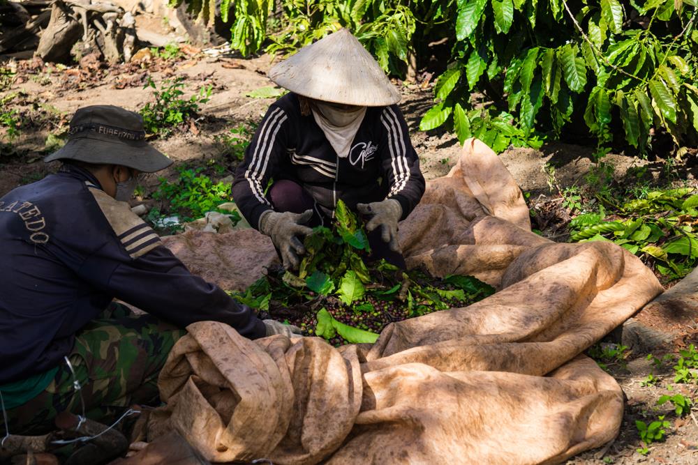 Để việc thu hoạch diễn ra nhanh chóng, người nông dân thường bắt đầu ngày làm việc từ sáng sớm. Khi ấy, một tấm bạt lớn được trải dưới gốc cây để hứng quả cà phê chín tuốt từ cành. Cứ thế, tấm bạt được kéo từ gốc này sang gốc khác tới khi đầy, người thu hoạch lọc bỏ lá rụng và cành gẫy sau đó mới đem phơi.
